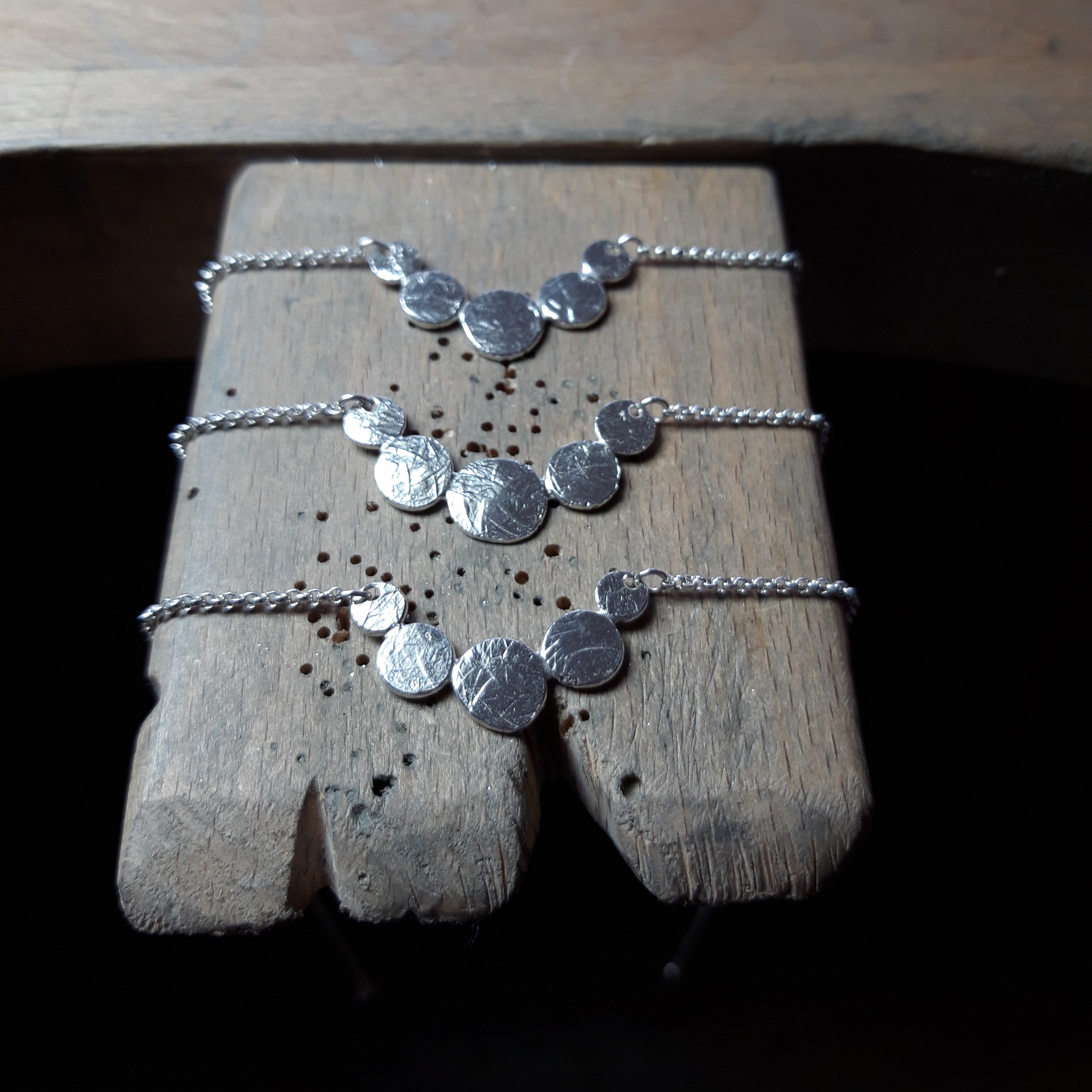 Réalisés avec des chutes d'argent, fondu en perle puis frappée à la main, les formes organiques qui composent chaques motifs sont uniques. Votre collier de la collection Aphaïa l'est aussi puisque d'un collier à un autre de légères variations de proportion sont possibles, signature d'un travail artisanal certain.